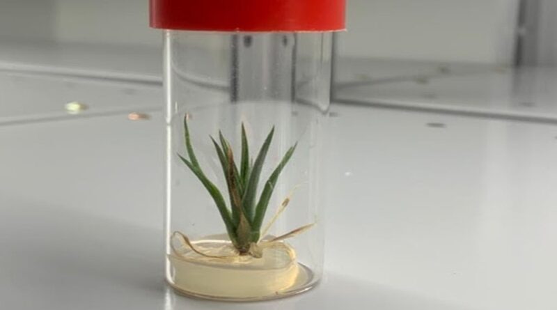 Espécime de Dyckia sp. germinada via técnica de cultura in vitro e em desenvolvimento nos laboratórios da URPD de Piracicaba da