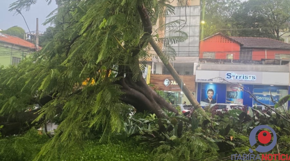 Durante uma forte chuva que caiu na tarde desta segunda feira 09/02/2026 uma árvore que ficava na Av Daniel Jardim De Grisolia no Centro de Itabira tombou e assutou quem passava pelo local.