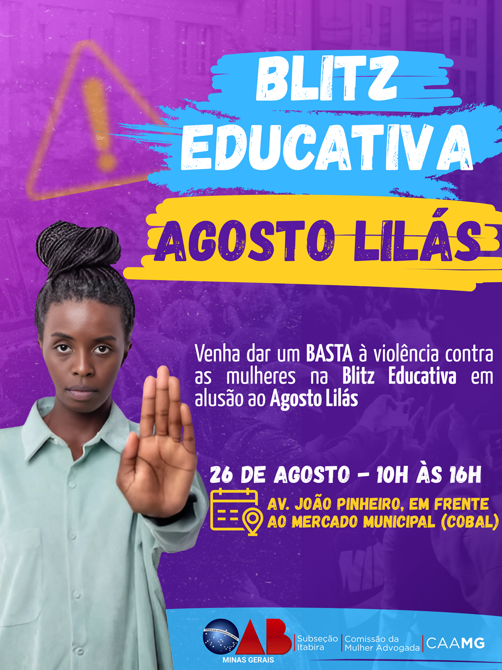 A OAB Itabira, por meio da Comissão da Mulher Advogada, realizará no dia 26 de agosto, das 10h às 16h, uma Blitz Educativa em alusão ao Agosto Lilás, cuja finalidade é promover a conscientização e o combate à violência contra a mulher.