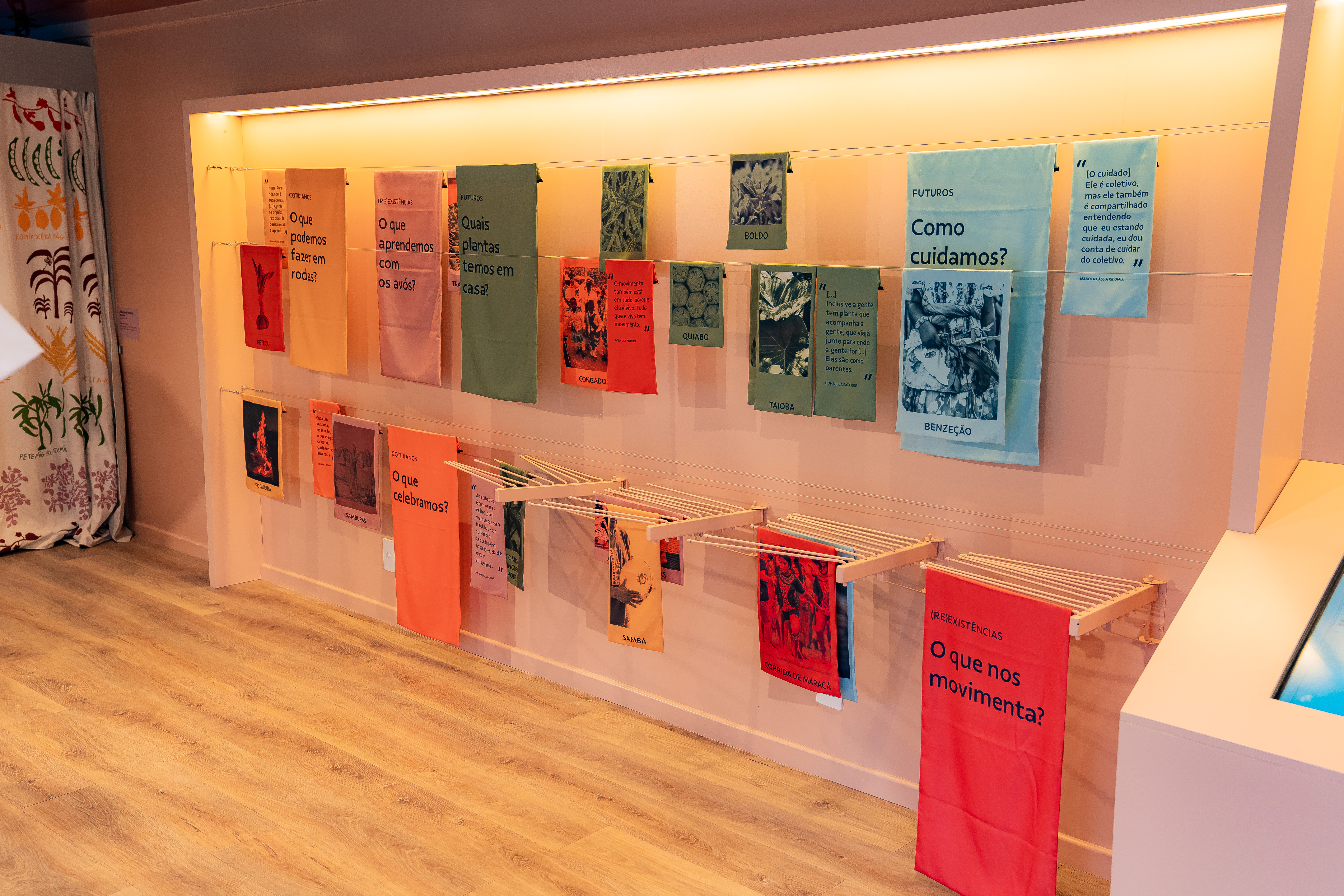 Finalmente, o Varal dos Saberes é uma obra interativa que convida o público a refletir sobre os eixos curatoriais da exposição através de perguntas, imagens e um mapa digital com informações sobre a ocupação territorial de Minas Gerais por povos indígenas e comunidades quilombolas. Nesta obra, os eixos curatoriais se manifestam a partir de seis perguntas, em que a curadoria oferece um grupo de palavras e imagens de celebrações, alimentos e experiências relacionadas aos povos indígenas e quilombolas.