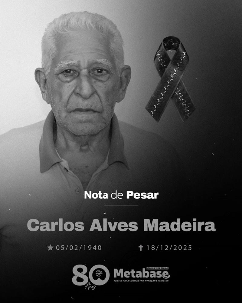 O Sindicato Metabase de Itabira e Região comunica, com profundo pesar, o falecimento de Carlos Alves Madeira, aos 85 anos, ocorrido na manhã desta quinta-feira (18). Histórico dirigente sindical, Carlos Madeira foi uma das mais importantes referências na luta em defesa dos direitos dos trabalhadores, aposentados e pensionistas de Itabira e região.