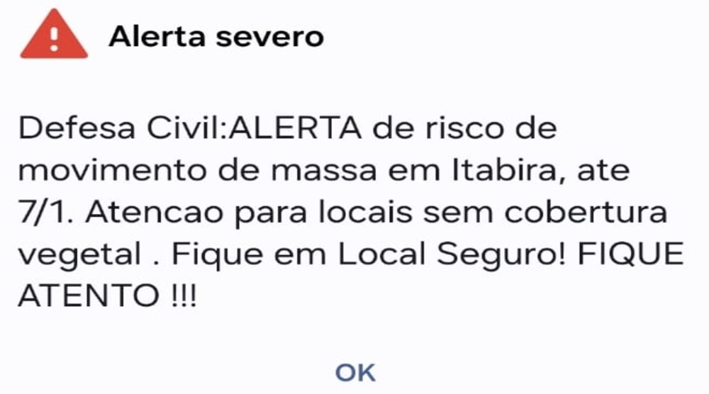 GERALITABIRA E REGIÃO Urgente – Itabira recebe Alerta Severo de risco da Defesa Civil; veja na íntegra 5 de janeiro de 2026 Ronniel Nascimento Por volta das 16:30 vários celulares registrado em Itabira receberam um Alerta Severo de risco da Defesa Civil relatando risco de movimento de massa na cidade (ou seja, deslizamento de terra e barrancos). veja na íntegra: COMPARTILHAR